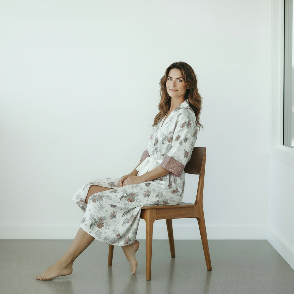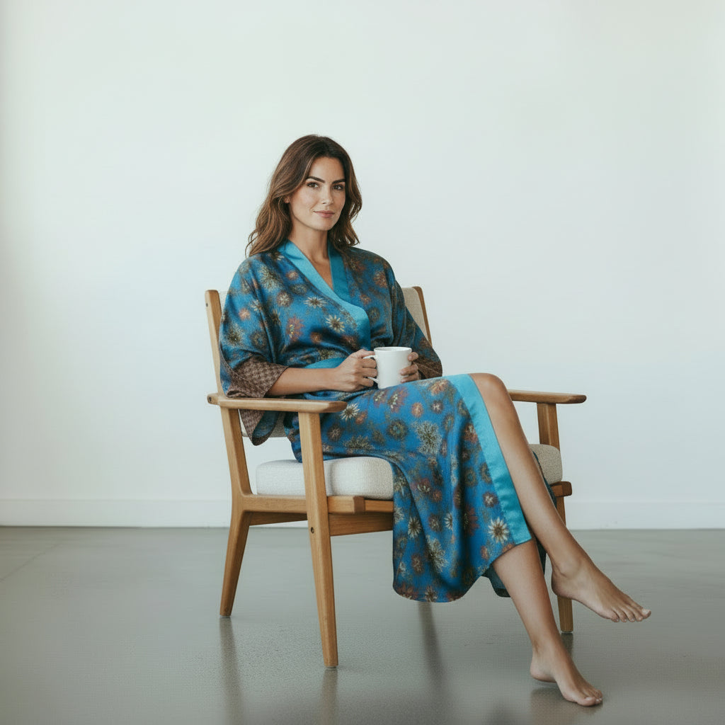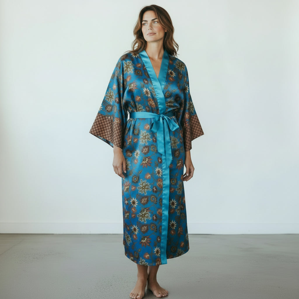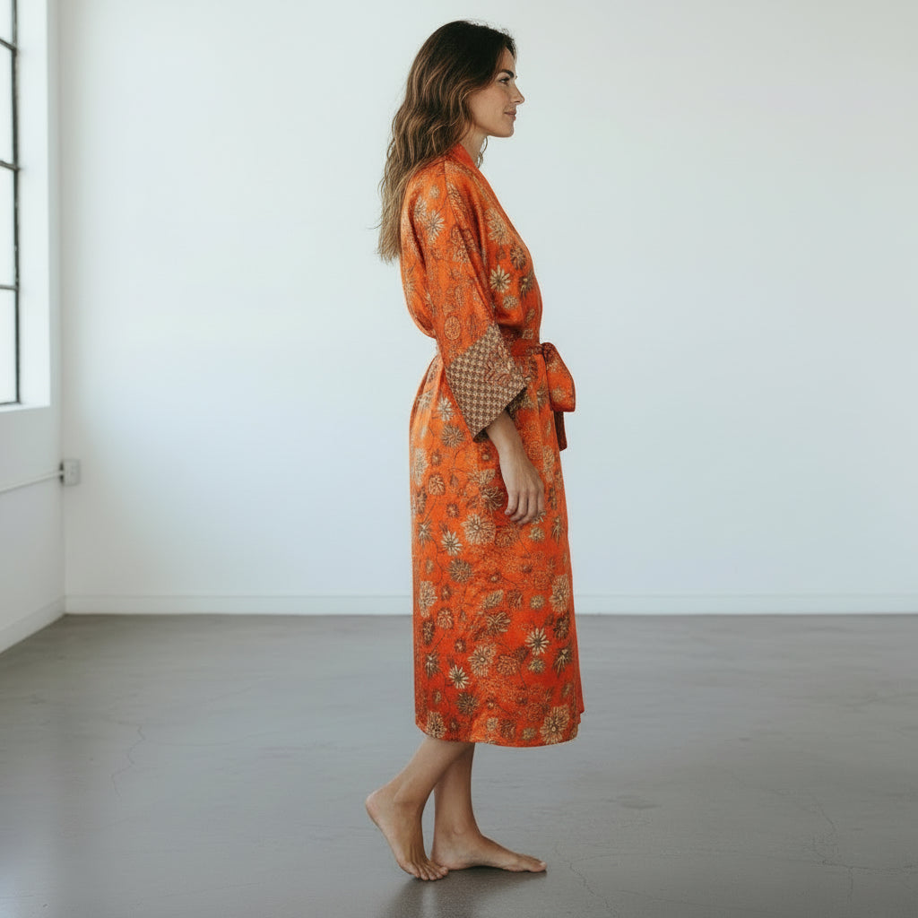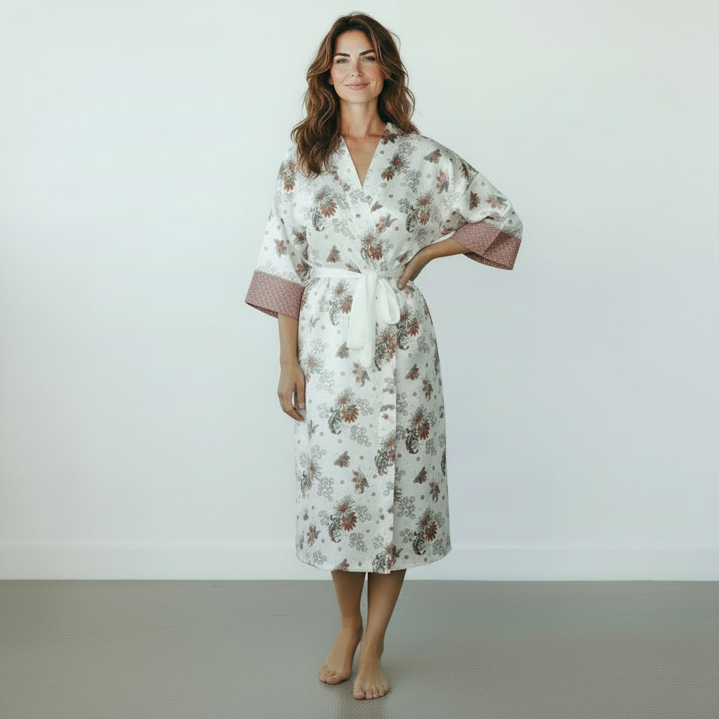 Le satin, avec son éclat subtil, apporte une touche de sophistication contemporaine. Il joue avec la lumière d'une manière plus douce, plus enveloppante. Le coton et la rayonne offrent une approche plus décontractée, parfaite pour le quotidien. Chaque matière raconte une histoire différente, invite à un moment différent : la soie pour l'exceptionnel, le satin pour l'élégance du soir, le coton pour la douceur du matin. C'est cette diversité de textures et de sensations qui rend le kimono si singulier — il n'impose pas une matière unique, il invite à explorer tout un univers tactile.